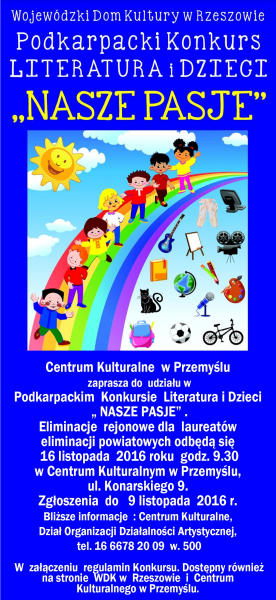 Miejski Ośrodek Kultury im. Oskara Kolberga w Przeworsku informuje,że eliminacje powiatowe Podkarpackiego Konkursu Literatura i Dzieci pod hasłem "Nasze Pasje" odbędzie się 14 listopada 2016 r. o godz. 10.00 w sali widowiskowej MOK.