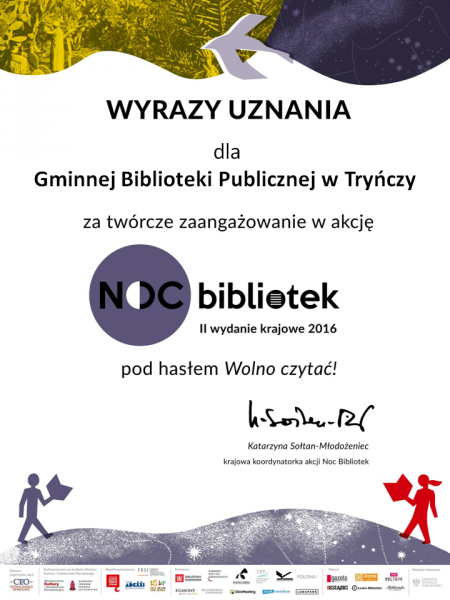 Podziękowania za udział w akcji Noc Bibliotek 2016 dla Gminnej Biblioteki Publicznej w Tryńczy