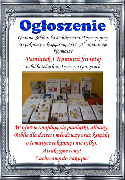 więcejGminna Biblioteka Publiczna w Tryńczy przy wspołpracy z księgarnią "NOVA" organizuje kiermasze Pamiątek I Komunii Świętej w bibliotekach w Tryńczy i Gorzycach.
