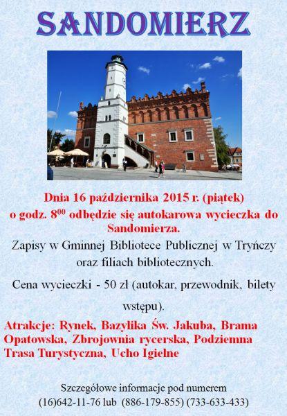 więcejDnia 16 października 2015 r. (piątek) odbędzie się autokarowa wycieczka do Sandomierza. Zapisy w Gminnej Bibliotece Publicznej w Tryńczy oraz filiach bibliotecznych.