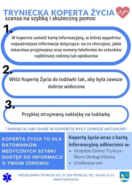 Tryniecka Koperta Życia może uratować życie lub zdrowie, dlatego zwracamy się z prośbą do mieszkańców o pomoc w rozpropagowaniu akcji i przekazanie kopert osobom, którym może okazać się pomocna.