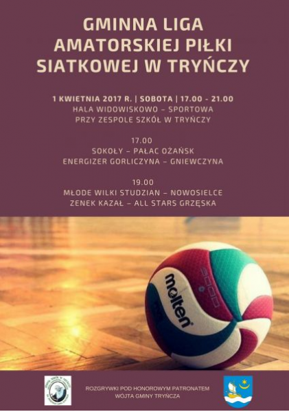 1 kwietnia 2017 r. na Hali widowiskowo-sportowej przy Zespole Szkół w Tryńczy rozpoczną się rozgrywki Gminnej Ligi Amatorskiej Piłki Siatkowej. W turnieju weźmie udział 8 drużyn, które przez dziesięć kolejnych sobót będzie walczyć o zwycięstwo w końcowej klasyfikacji. Wszystkich pasjonatów piłki siatkowej zapraszamy do śledzenia rozgrywek.