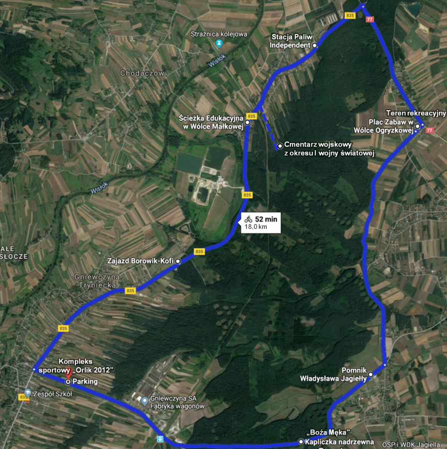 18-kilometrowa trasa rozpoczyna się obok kompleksu sportowego „Orlik 2012” w Gniewczynie Łańcuckiej, skąd wyruszamy w stronę Jagiełły.