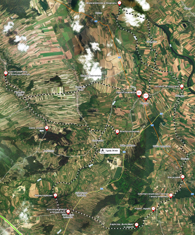 Najdłuższa jak do tej pory, prawie 53 kilometrowa trasa prowadzi nas po gminie Tryńcza oraz gminie Grodzisko Dolne, a rozpoczyna się obok Orlika w Tryńczy, skąd wyruszamy w stronę Głogowca.
