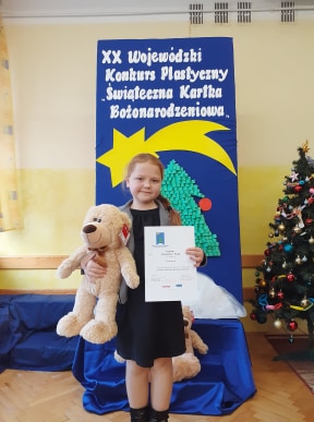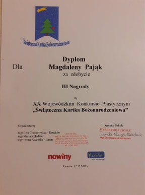 12 grudnia 2019 r. w Zespole Szkolno-Przedszkolnym nr 6 w Rzeszowie odbył się finał XX Wojewódzkiego Konkursu Plastycznego "Świąteczna Kartka Bożonarodzeniowa” pod honorowym patronatem Biskupa Edwarda Białogłowskiego, Prezydenta Miasta Rzeszowa, Podkarpackiego Kuratora Oświaty, Proboszcza Parafii Św. Michała Archanioła, GC Nowiny, Katolickiego Radia VIA. Nadesłano 430 świątecznych kartek z 38 placówek i szkół województwa podkarpackiego. Celem konkursu było zainteresowanie dzieci w wieku 6-10 lat tradycjami i zwyczajami chrześcijańskimi towarzyszącymi Świętom Bożego Narodzenia, rozwijanie ich wyobraźni i kreatywności. Istotnym elementem oceny była indywidualność pracy wyrażona w prostocie, samodzielności i szczerości dziecięcej wypowiedzi twórczej. Jury doceniło trud pracy każdego twórcy i przyznało nagrody i wyróżnienia. Z Publicznej Szkoły Podstawowej w Ubieszynie III Nagrodę otrzymała uczennica klasy III Magdalena Pająk.