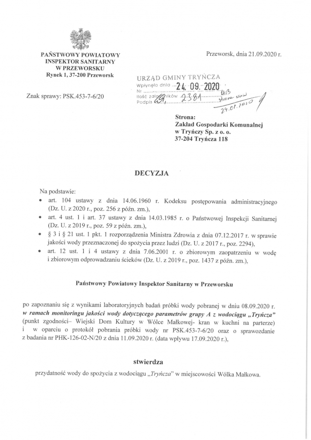 Państwowy Powiatowy Inspektor Sanitarny w Przeworsku stwierdza przydatnośc wody do spożycia z wodociągu "Tryńcza" w m. Wólka Małkowa.