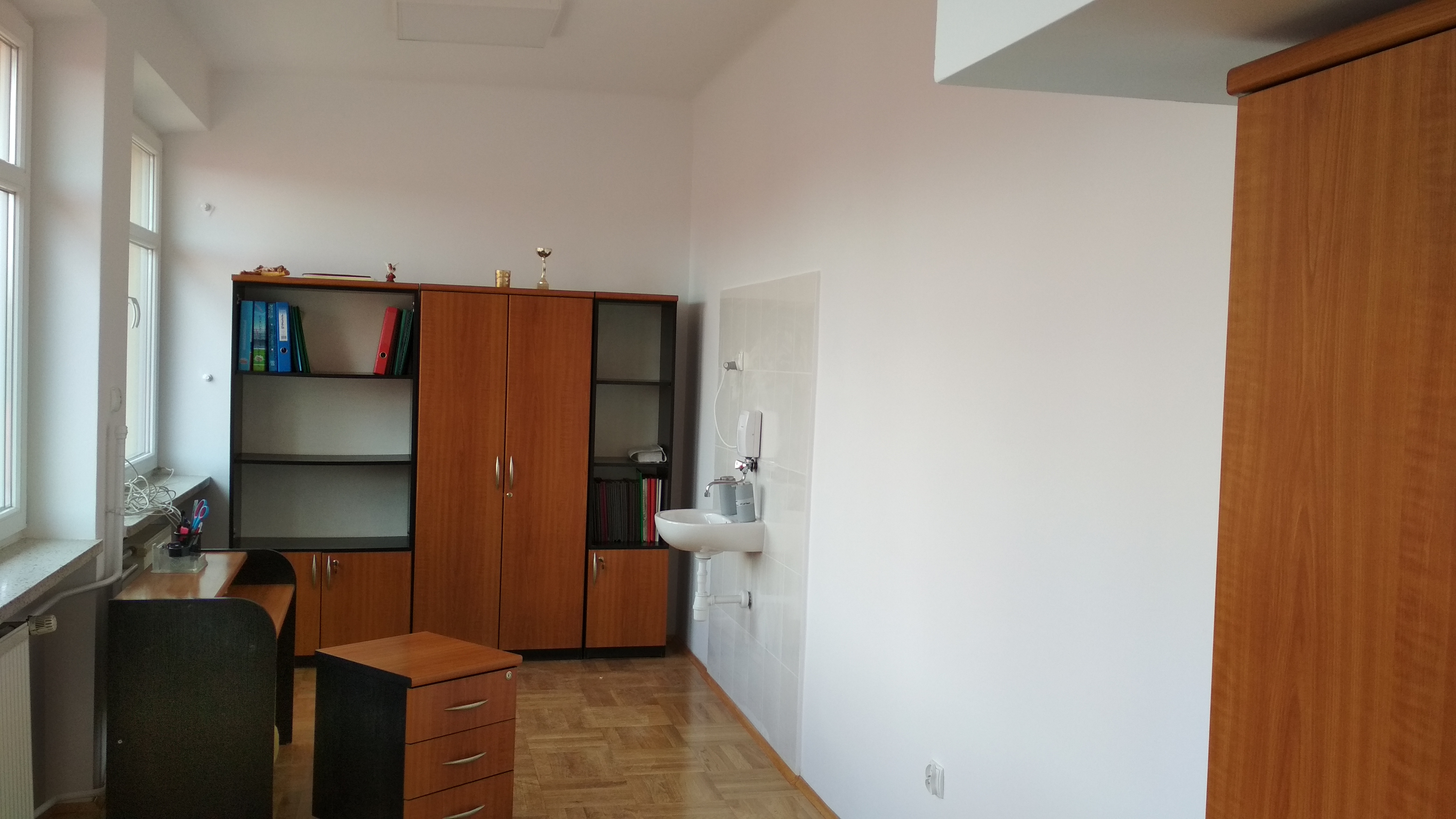 Po ukończeniu remontu na pierwszym piętrze, teraz pora na parter! W miejscu gdzie była stara biblioteka przygotowano ściany do całkowitego odświeżenia. W tym samym pomieszczeniu przygotowano profile do montażu sufitu podwieszanego.