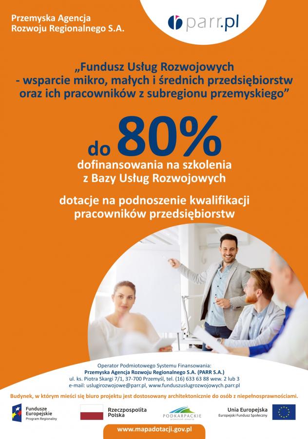 Miło nam poinformować, że Przemyska Agencja Rozwoju Regionalnego S.A. od 10 listopada prowadzi XXI nabór wniosków w ramach projektu „Fundusz Usług Rozwojowych - wsparcie mikro, małych i średnich przedsiębiorstw oraz ich pracowników z subregionu przemyskiego”.