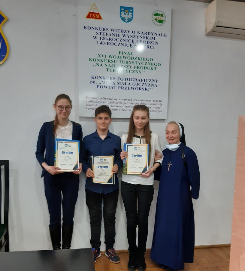 W dniu 16 listopada 2021 r. w sali konferencyjnej Starostwa Powiatowego w Przeworsku odbyło się uroczyste wręczenie nagród laureatom konkursu wiedzy o bł. Kardynale Stefanie Wyszyńskim. Konkurs został zorganizowany przez Starostwo Powiatowe w Przeworsku i Polskie Towarzystwo Turystyczno-Krajoznawcze Oddział w Przeworsku w ramach realizowanego zadania publicznego pod nazwą ”Edukacja patriotyczna dzieci i młodzieży szkolnej poprzez konkursy w 120 rocznicę urodzin bł. Kardynała Stefana Wyszyńskiego i 40 rocznicę śmierci”. Miło nam poinformować, że wśród laureatów znaleźli się uczniowie szkoły podstawowej im. św. Jana Kantego w Tryńczy. Zaszczytne I miejsce otrzymał Wojciech Hanejko z kl. VIII a, II miejsce otrzymała Klaudia Płonka z kl. VIII a, zaś III miejsce przypadło Oliwii Palikij również z kl. VIII a. Uczniowie, którzy do udziału w konkursie przygotowywali się pod opieką s. Anny Macina, otrzymali dyplomy i nagrody książkowe. Gratulujemy sukcesów i życzymy dalszych w innych konkursach.