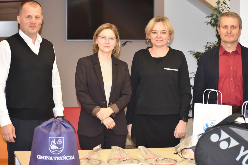 Dyrektor Szkoły Podstawowej z Gorzyc Izabela Misiło, dyrektor Szkoły Podstawowej z Tryńczy Elżbieta Kubrak oraz wicedyrektor Szkoły Podstawowej w Gniewczynie Łańcuckiej Józef Chajec odebrali z rąk Wójta profesjonalne rakietki i lotki do badmintona.