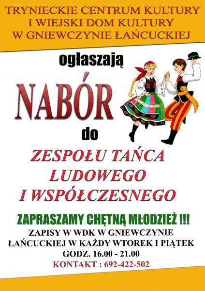 Trynieckie Centrum Kultury oraz Wiejski Dom Kultury w Gniewczynie Łańcuckiej ogłaszają nabór do Zespołu Tańca Ludowego i Współczesnego. Zapisy w Wiejskim Domu Kultury w Gniewczynie Łańcuckiej w każdy wtorek i piątek od godz. 16.00 do 21.00.