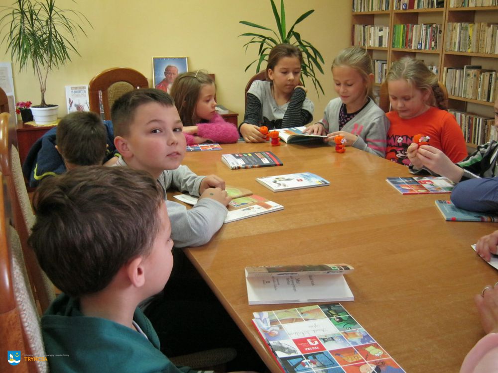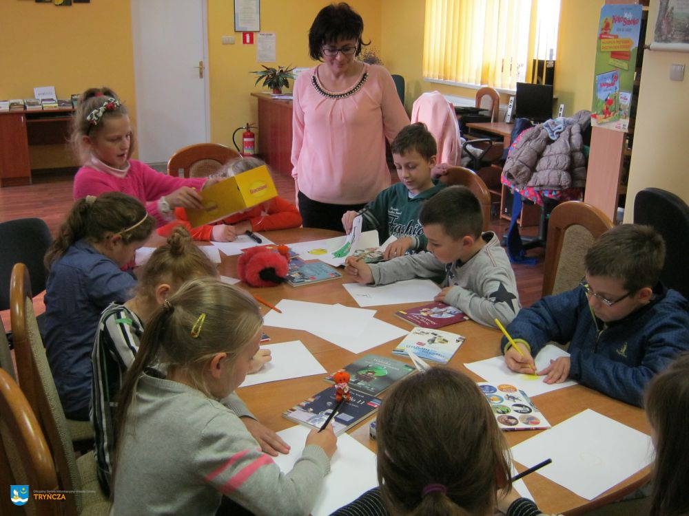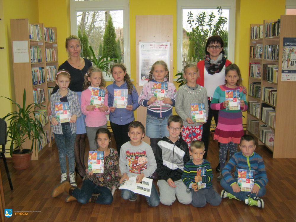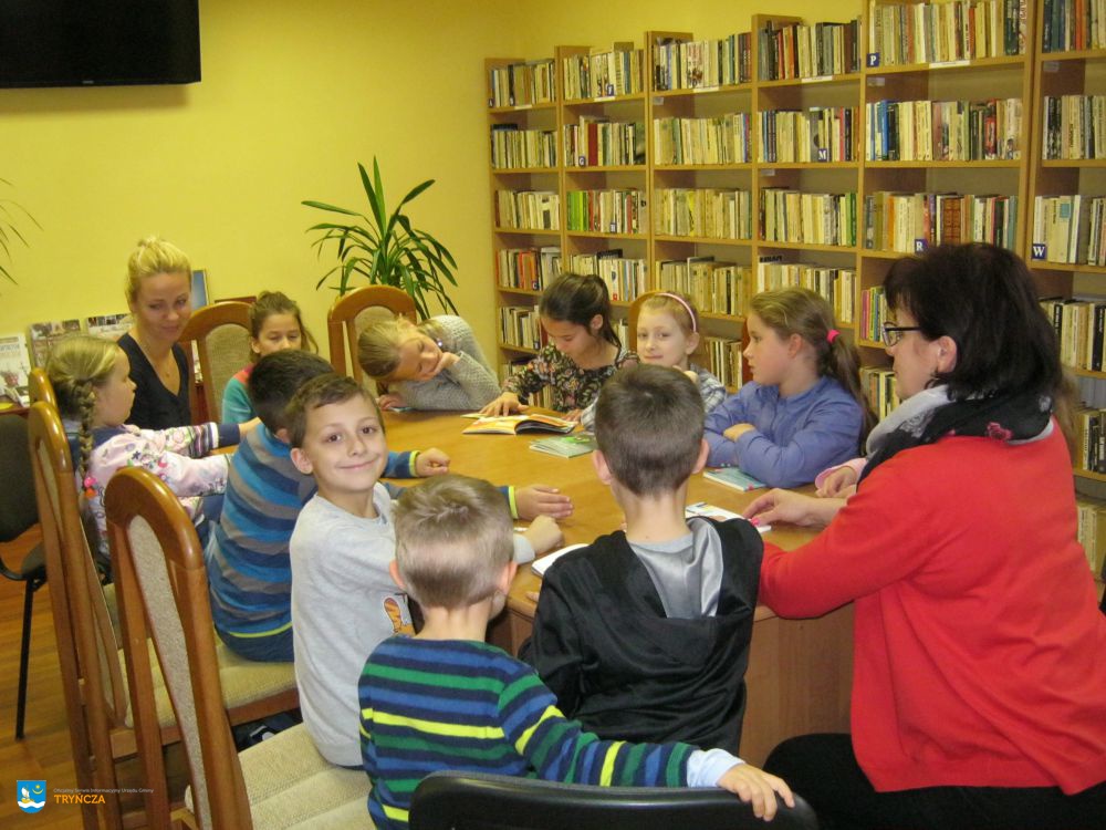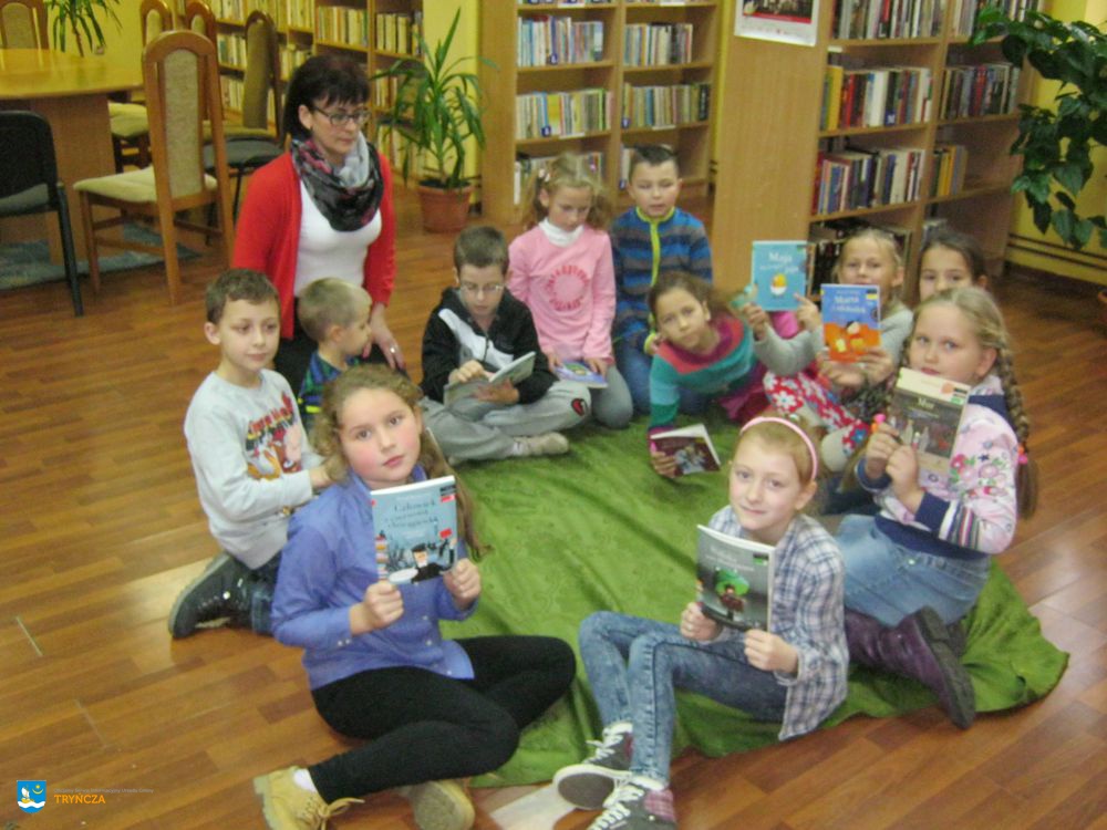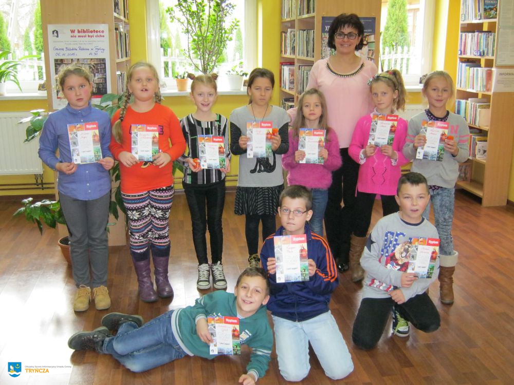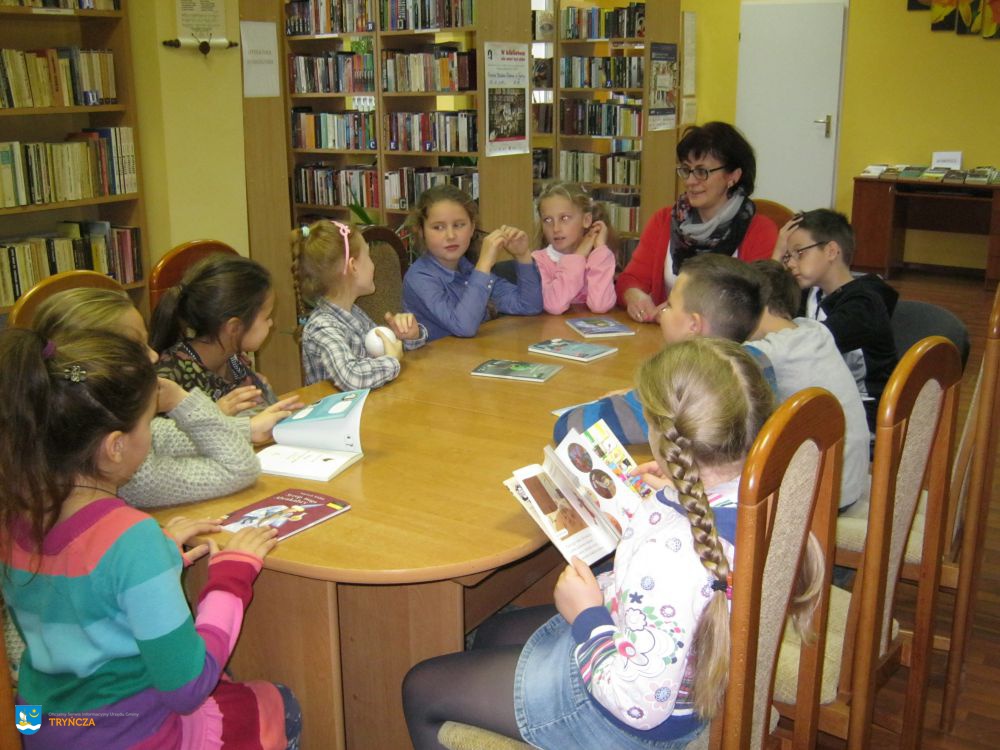 Uczniowie klasy trzeciej szkoły podstawowej wraz z wychowawczynią Panią Magdaleną Młynarską pojawili się trzy razy na warsztatach edukacyjnych przeprowadzonych w Gminnej Bibliotece Publicznej w Tryńczy w ramach akcji „Czytam sobie w bibliotece”. Na spotkaniu uczniowie czytali 9 książek z serii „Czytam sobie” od wydawnictwa Egmont. W prezencie młodzi czytelnicy otrzymali teczkę „Czytam sobie w bibliotece”, w której znajdują się kolorowanki, zakładki do książki, naklejki i dyplom.