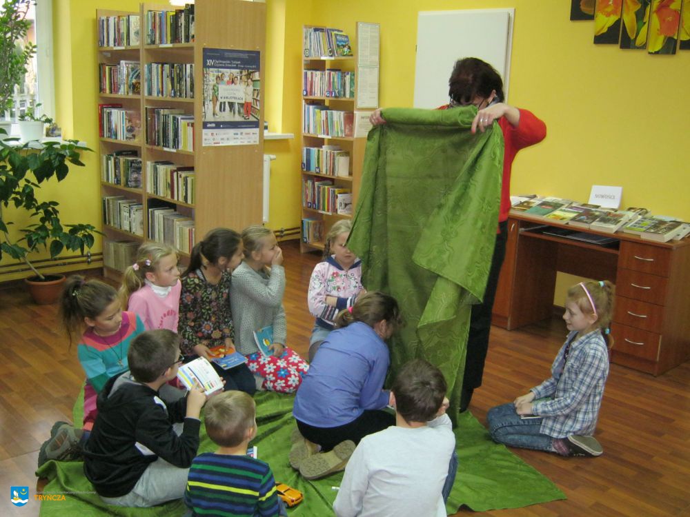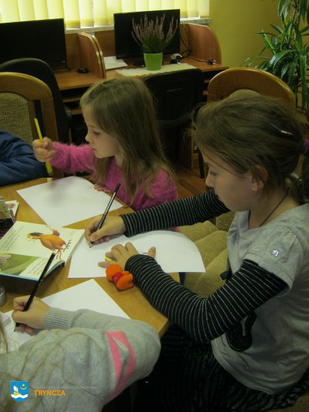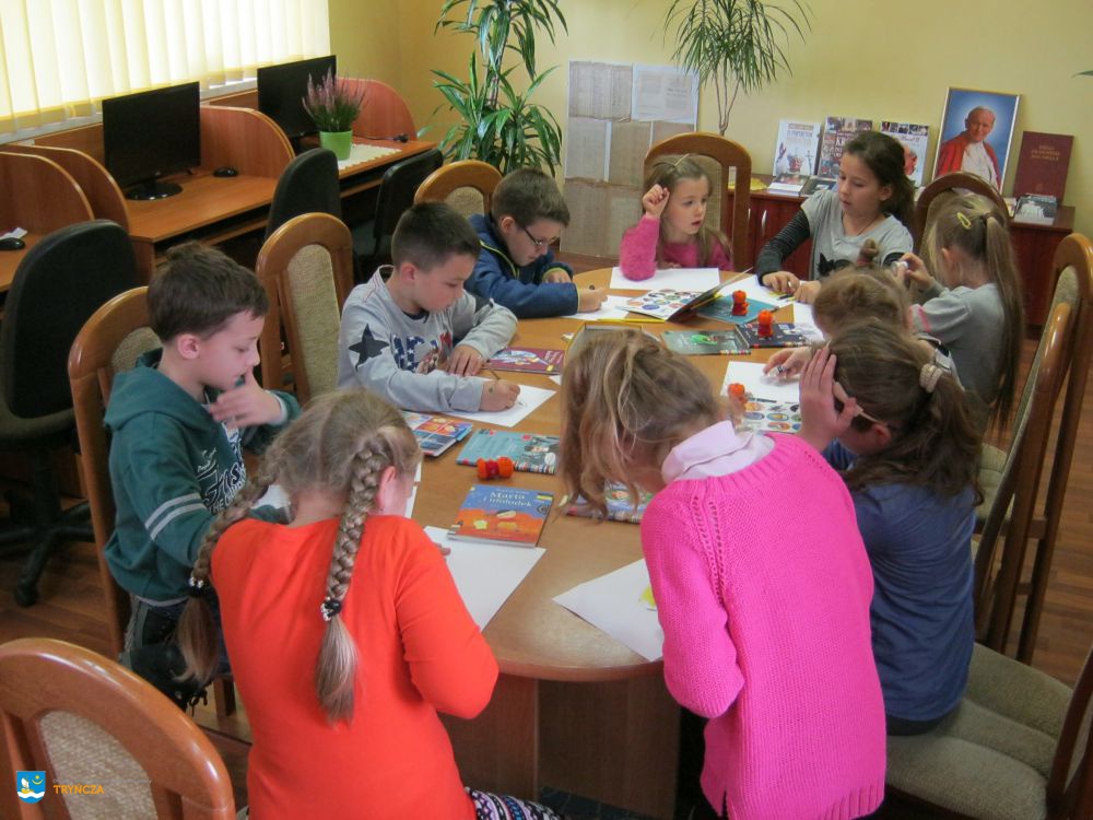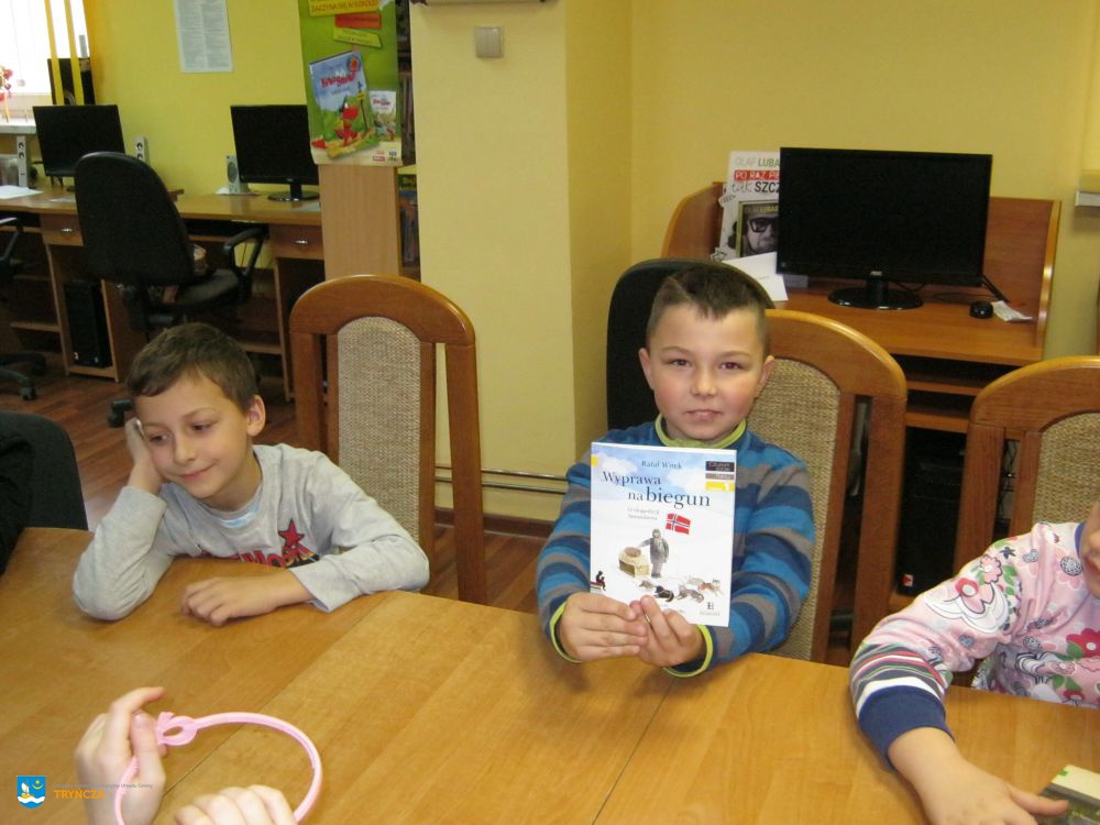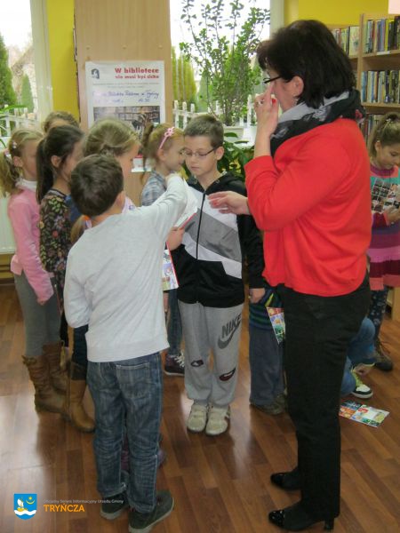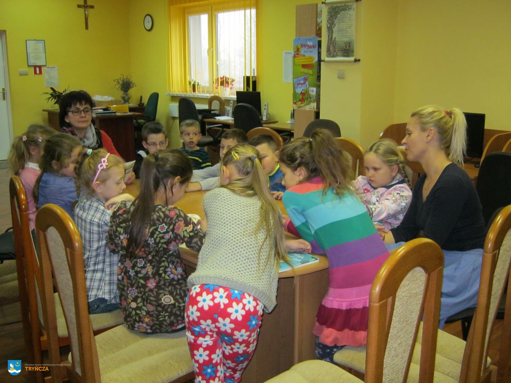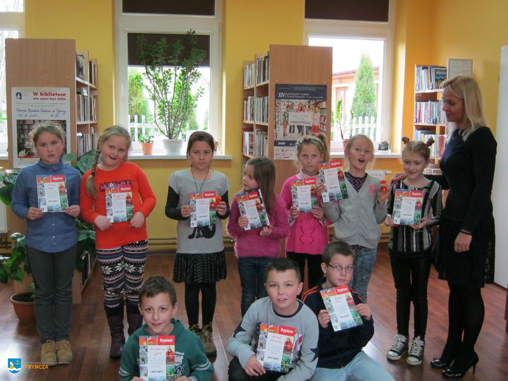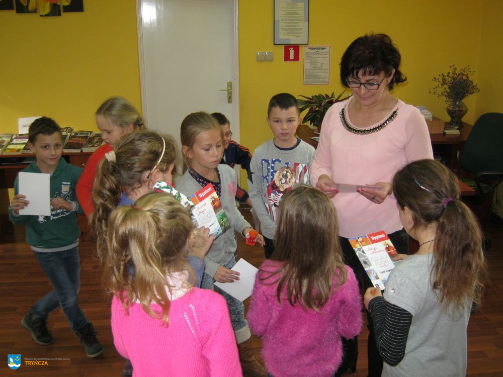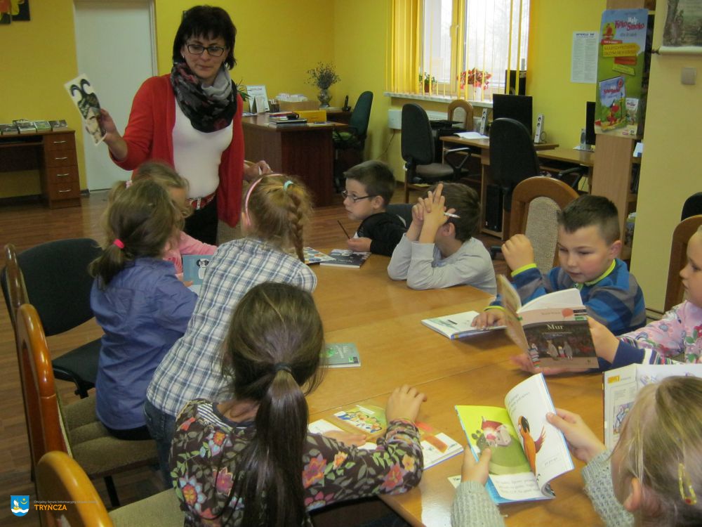 Uczniowie klasy trzeciej szkoły podstawowej wraz z wychowawczynią Panią Magdaleną Młynarską pojawili się trzy razy na warsztatach edukacyjnych przeprowadzonych w Gminnej Bibliotece Publicznej w Tryńczy w ramach akcji „Czytam sobie w bibliotece”. Na spotkaniu uczniowie czytali 9 książek z serii „Czytam sobie” od wydawnictwa Egmont. W prezencie młodzi czytelnicy otrzymali teczkę „Czytam sobie w bibliotece”, w której znajdują się kolorowanki, zakładki do książki, naklejki i dyplom.