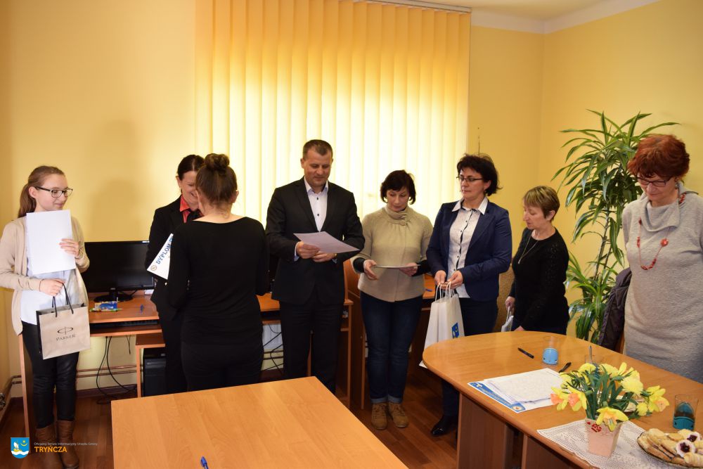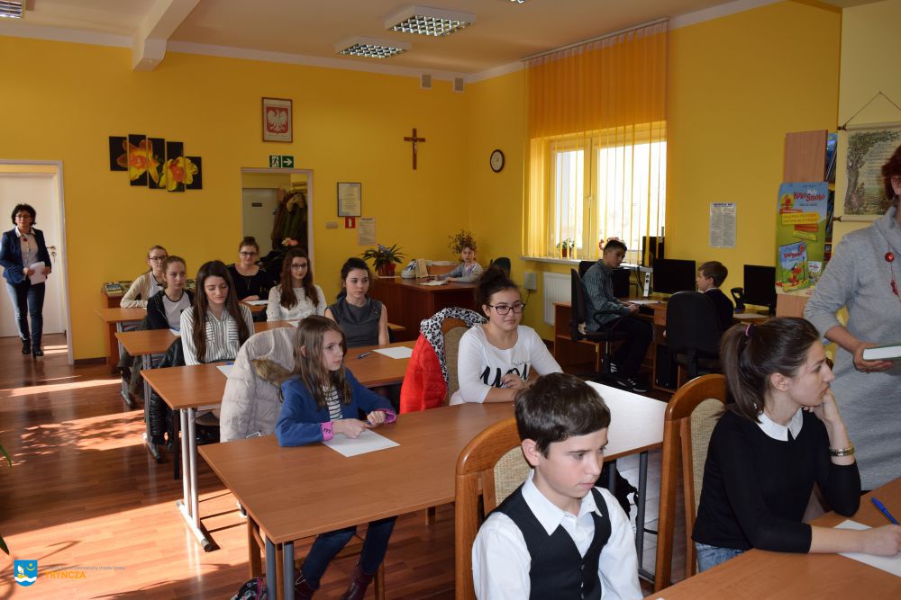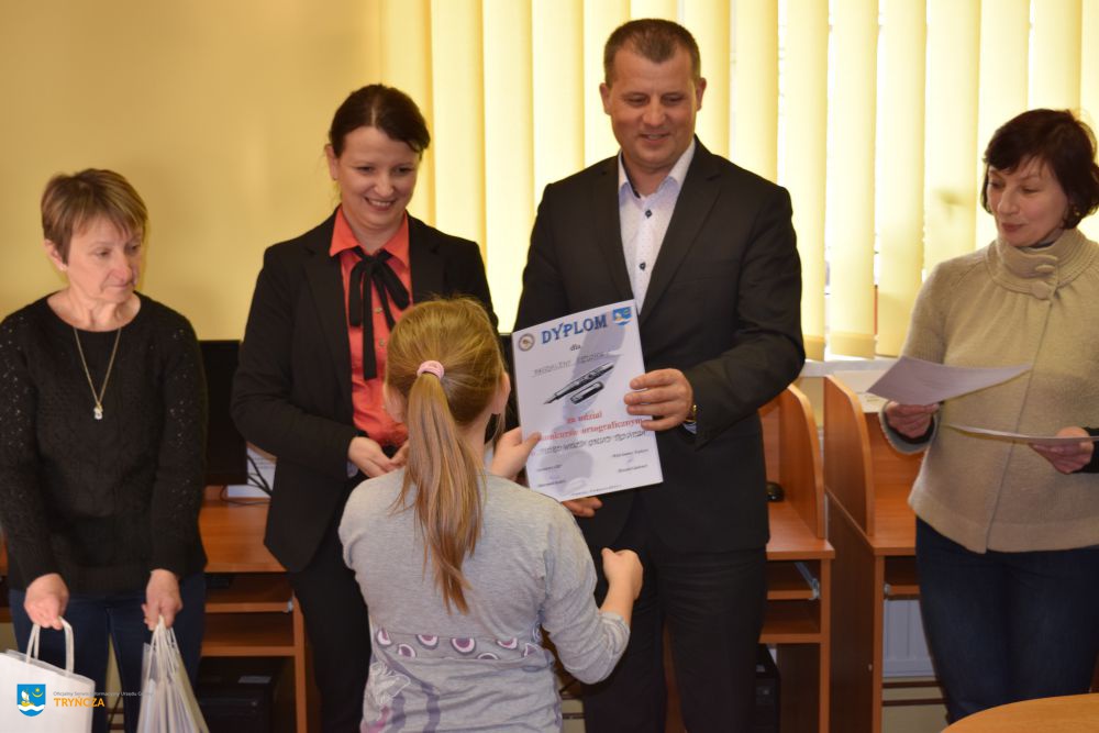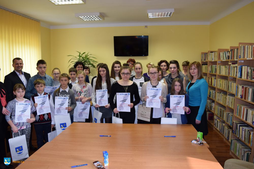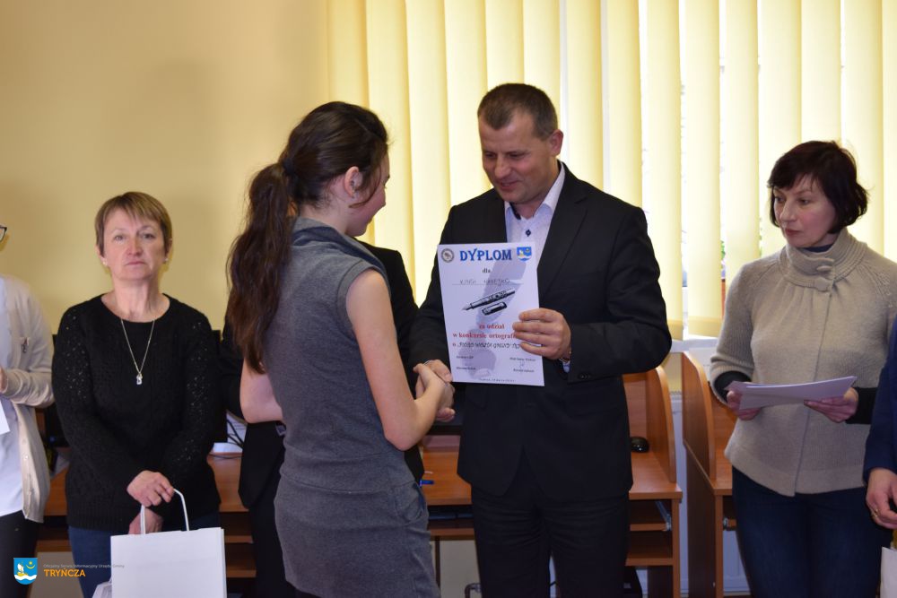 W piątek 18 marca 2016 r. w siedzibie Gminnej Biblioteki Publicznej w Tryńczy odbyła się III edycja Konkursu Ortograficznego o "Pióro Wójta Gminy Tryńcza".Konkurs skierowany był do uczniów klasy VI szkoły podstawowej oraz klas I-III gimnazjum, Konkurs miał na celu wyłonienie najlepszych uczniów w dziedzinie ortografii na terenie naszej gminy.W tym roku grupa uczniów przystępujących do pisania dyktanda była wyjątkowo liczna, bo liczyła aż 16 uczestników ze wszystkich pięciu szkół.Tekst tegorocznego dyktanda nie był łatwy."Roiło się" w nim od nagromadzonych nazw własnych, zdań wtrąconych, zrostów i nawet wyrazów o angielskiej pisowni. Ale nasi uczestnicy poradzili sobie w miarę dobrze z tymi swoistymi pułapkami ortograficznymi. Bezsprzecznym "Mistrzem Ortografii" i laureatem głównej nagrody - wiecznego pióra - ufundowanej przez Wójta Gminy Tryńcza Ryszarda Jędrucha została Aleksandra Chomicz, uczennica II klasy Gimnazjum w Tryńczy. Kolejne, II miejsce przypadło Julii Banaś, trzecioklasistce Gimnazjum w Tryńczy, zaś trzecie zdobyła Nina Konieczny, uczennica klasy VI Szkoły Podstawowej w Gniewczynie. Wszyscy pozostali uczestnicy również otrzymali dyplomy i nagrody rzeczowe ufundowane przez Gminną Bibliotekę Publiczną, a w czasie przerwy , podczas obrad jury, czekał na nich słodki poczęstunek.