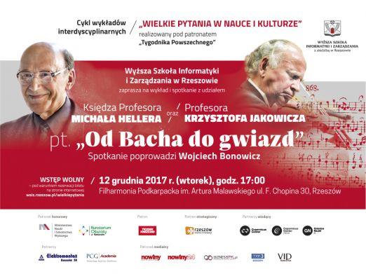 Spotkanie z udziałem dwóch wybitnych Profesorów i niekwestionowanych Autorytetów świata nauki i sztuki: ks. prof. Michała Hellera uczonego, kosmologa, filozofa i teologa, laureata prestiżowej Nagrody Templetona oraz prof. Krzysztofa Jakowicza wybitnego polskiego skrzypka, Mistrza muzycznych krajobrazów, odbędzie się 12 grudnia br. (wtorek), o godz. 17:00, w Filharmonii Podkarpackiej im. Artura Malawskiego w Rzeszowie. Wszystkich zainteresowanych, którzy chcą uczestniczyć w dyskusji o Bachu i gwiazdach oraz tych, którzy chcą wraz z Mistrzami posłuchać Bacha i podjąć próbę podsłuchania Kosmosu, zapraszamy do udziału w tym wyjątkowym wydarzeniu. Spotkanie poprowadzi Wojciech Bonowicz – poeta, redaktor i felietonista „Tygodnika Powszechnego”.